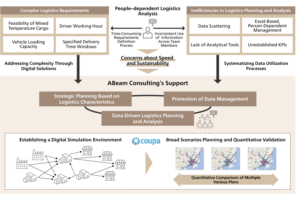 To maintain an optimal logistics system in a changing business environment and create new business opportunities, ABeam Consulting supported the establishment of a quantitative logistics evaluation framework using digital technologies.