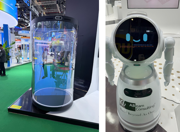 在展台互动体验方面,ABeam精心打造了多个科技感十足的展示区域。全息投影舱、人形机器人展示了人工智能在客户服务领域的应用前景。