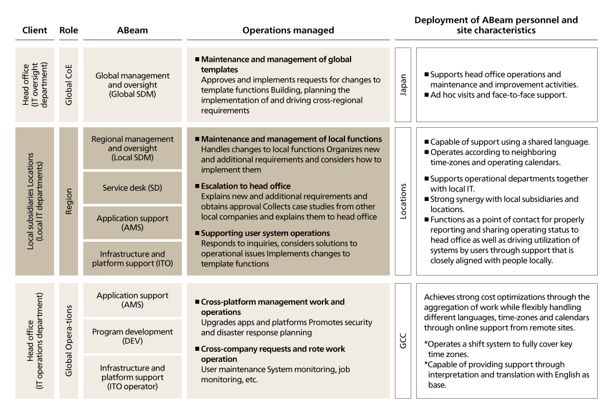 In global operations for core systems, IT teams face demands for flexible handling of each location’s individual wants and circumstances, as well as for the aggregation of information through platform integration and the achievement of unified governance. ABeam Consulting both visualizes the complete picture by head office through the building of structures that summarize each location by region and supports the use of local systems.