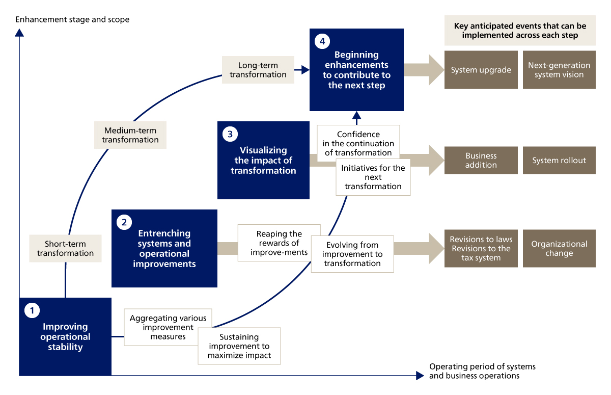 Even when beginning new initiatives that champion transformation, the fact is that such transformation initiatives tend to become mere formalities, with teams reverting to the maintenance and routine operation of existing systems. ABeam Consulting supports post-implementation continuous improvement activities and drives development towards subsequent transformation with the aim of consolidating transformation measures and maximizing their output.