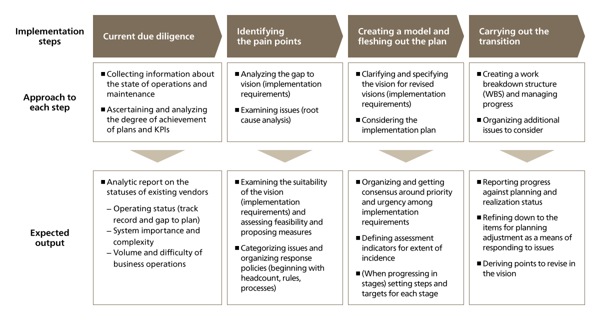When passing on or integrating work from existing vendors, ABeam Consulting leverages its strong track record in global support structures, and proposes and executes concrete measures aimed at realizing improvements, optimizations and streamlining of costs. We drive smooth transition while minimizing adverse impact on business by working with IT departments, operational departments and the vendor being succeeded, based on a sufficient anticipation of the risks.