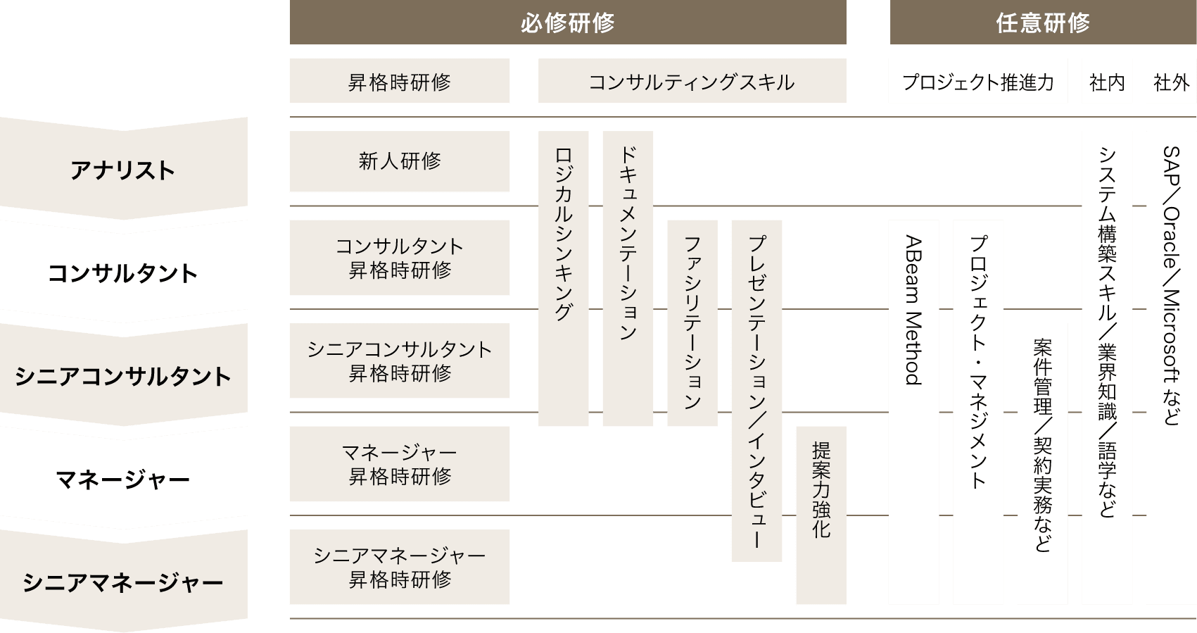 アビームはグローバル企業の一員として、グローバルチームの経験豊富なトレーナーによる充実したコンサルティングのための標準トレーニングコースを提供しています(開催地は日本または他海外拠点)。アビームコンサルティングの社員は、グローバルチームの一員として、世界トップクラスのプロフェッショナルとして活躍するために、世界のどこででもその知識やスキルを即座に活用することができます。