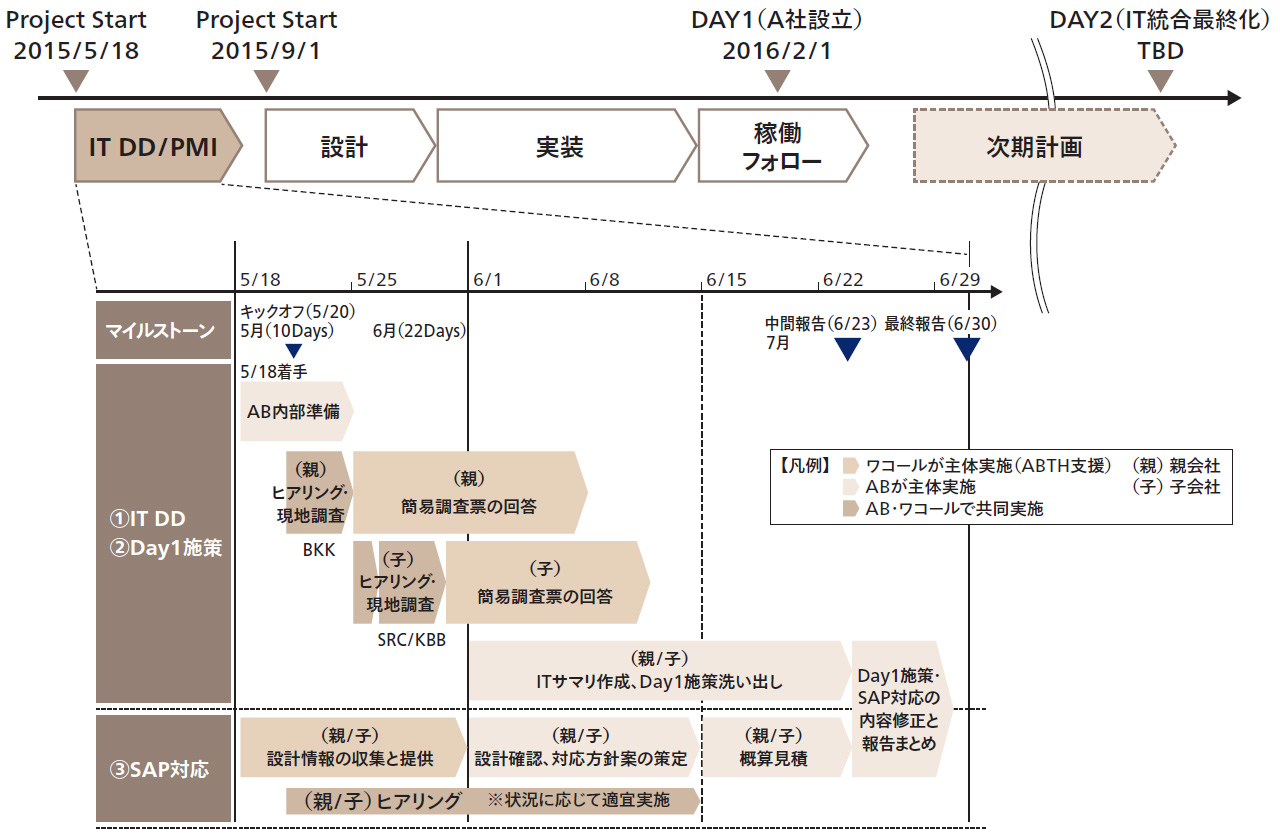 だが、これらのプロジェクトがキックオフしたのは2015年5月のこと。A Tech社が事業をスタートする2016年2月1日までの、わずか10カ月のタイトなスケジュールでシステムの暫定対応を完了し、新体制へ移行しなければならない。その期限から逆算すると、IT Due Diligenceにかけることができる時間は2015年6月末までの実質1カ月半しかなかった。