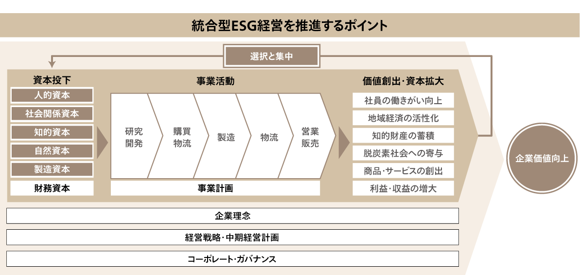 統合型ESG経営への変革には、ESGを含む5つの非財務資本を管理し、いかに自社が企業価値向上までの価値関連性を紡いできたかを解明し、寄与度の高い取り組みの「選択と集中」を繰り返すことが重要です。