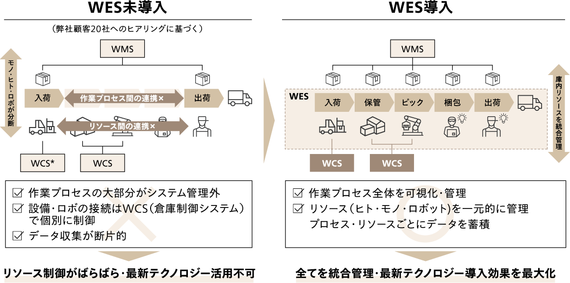 WESとは、マテハン・ロボットとの接続性の簡易化、人を含めたリソースの制御・稼働データ取得によるプロセスとの統合管理が可能な倉庫実行管理システムです。柔軟性も高く、AI やデジタルツインといった最新テクノロジーを活用したシステムの土台を築くことができ、物流DXの実現性を飛躍的に高めます。