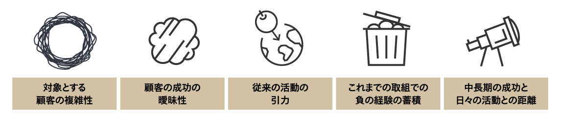 アビームコンサルティングでは、その背景に、欧米企業と比較すると、日本企業では、個人・部署・企業のそれぞれのレベルで「成功」が明確に定義されていることが稀であることや、これまでにマーケティング領域でのビッグワードに振り回された現場での負の経験の蓄積などが存在していると考えています。