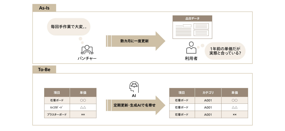 積算・調達時に、品目名称が統一されておらず、タイムリーに正確な単価を把握できない状況を打破するために、生成AI等を活用して単価情報の名寄せやカテゴリ分けを行います。ベンチマーク単価DBシステムを構築することにより、共通単価の可視化を推進し、適正価格での調達を実現します。