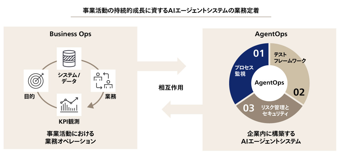 AIエージェントシステムの業務定着と運用改善を図るうえで、AgentOpsは欠かせない存在です。AgentOpsでは「テストフレームワーク」「プロセス監視」「リスク管理とセキュリティ」の3つを重要な観点とし、これらに基づいて導入・業務定着を実現します。