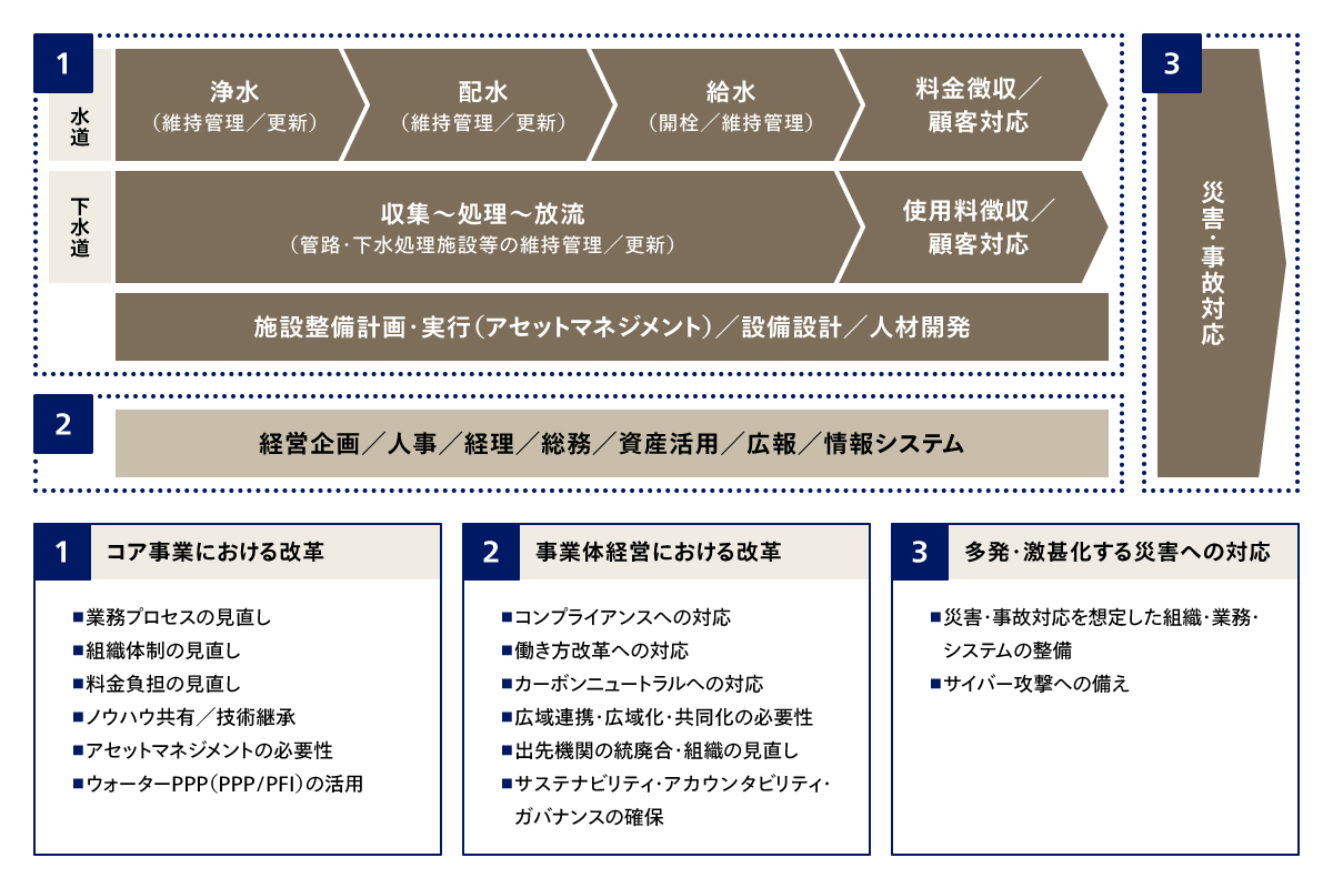 こうした経営環境の複雑化により、上下水道領域では多くの改革テーマへの取組みが求められています。