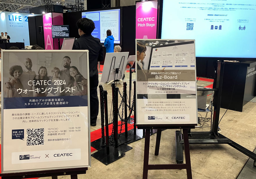 このような背景から、アビームコンサルティングではこれまでも幾度となく共創の場を作ってきた。CEATEC 2024においても、企業・自治体の課題と来場企業のマッチングを通じて商談機会を創出する課題発信型企画「Biz-Board」や来場者の課題・関心領域をもとに、当社の共創プロフェッショナルが新進気鋭のスタートアップを厳選紹介する「ウォーキングブレスト」を実施した。