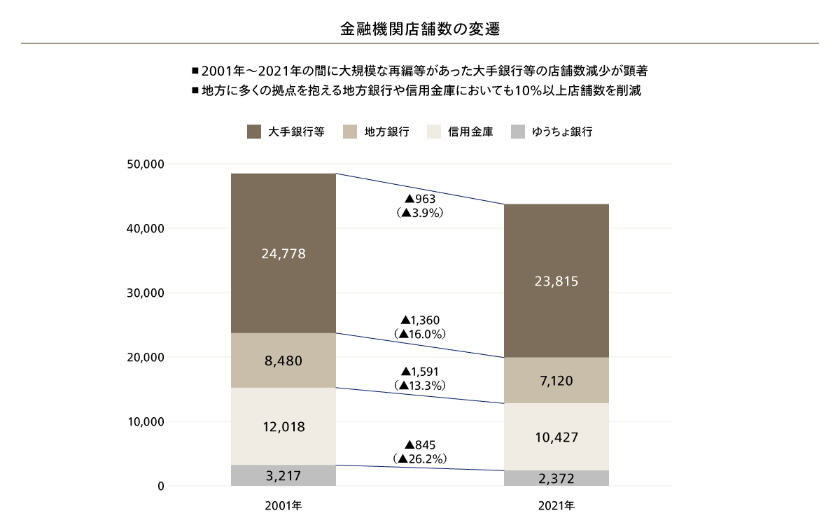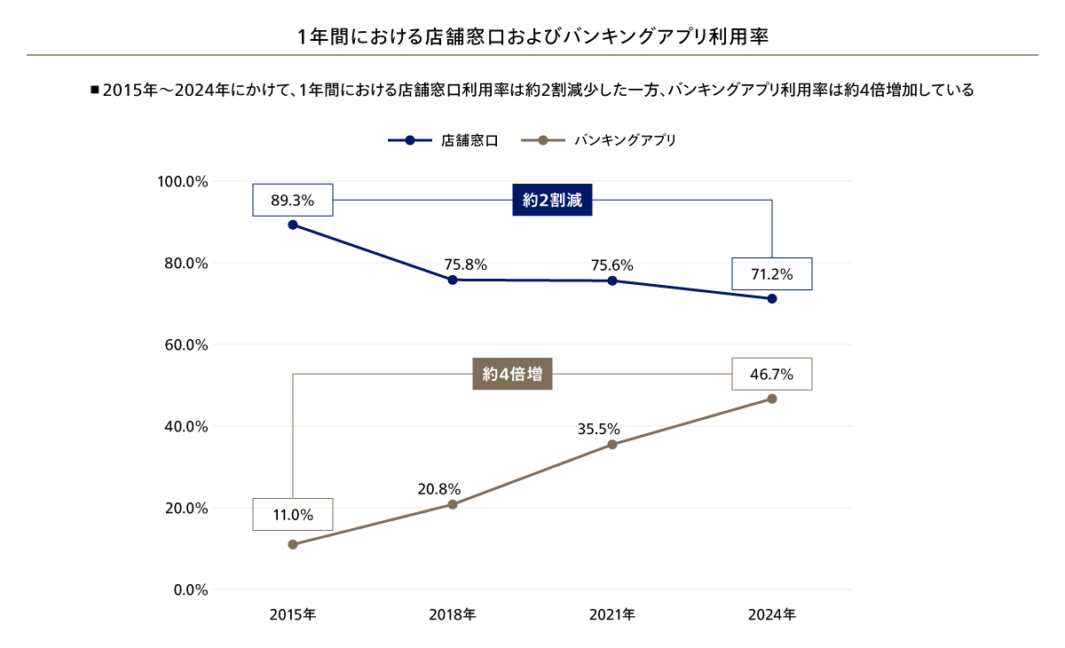 外部環境の変化に対応するため、多くの金融機関が店舗再編やデジタル投資を進めてきたものの、対面・非対面チャネル全体でみると、生産性と顧客接点において、後述の三点の構造的な課題が顕在化している。