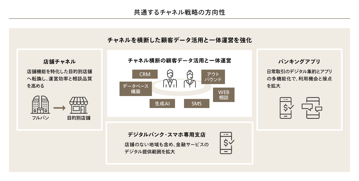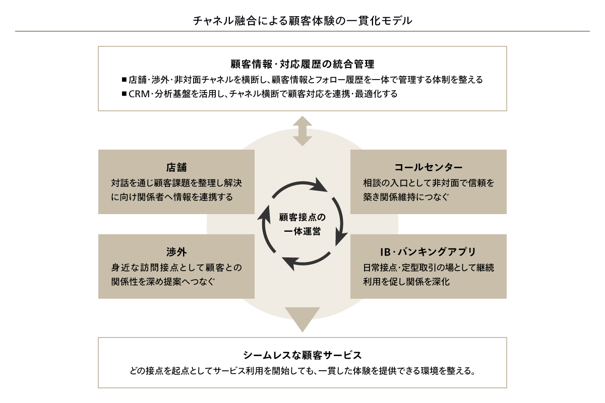 こうした分析結果を踏まえ、来店・取引データに基づき店舗と各チャネルの役割を見直すとともに、定型業務の電子化・集約・自動化によって創出した人員を相談・提案業務へ振り向けていくことが重要である。同時に、スキル定義から育成・評価・配置までを一体で運用し、相談とデジタルの双方に対応できる人材を体系的に育成することが求められる。また、データ定義や管理ルールを統一した共通基盤を整備し、全チャネルで顧客情報と対応履歴を一元管理することで、経営・本部・営業店が同一の指標に基づき意思決定できる体制を構築する必要があると考えられる。