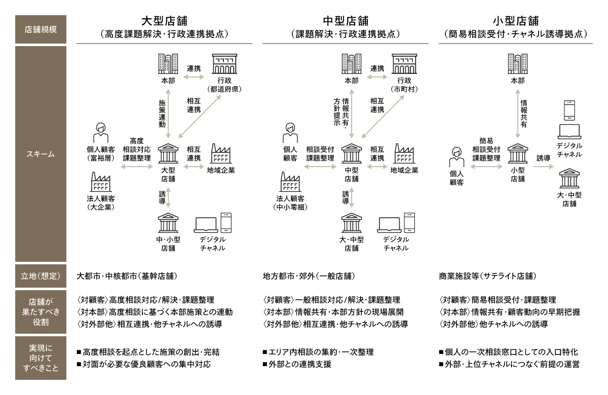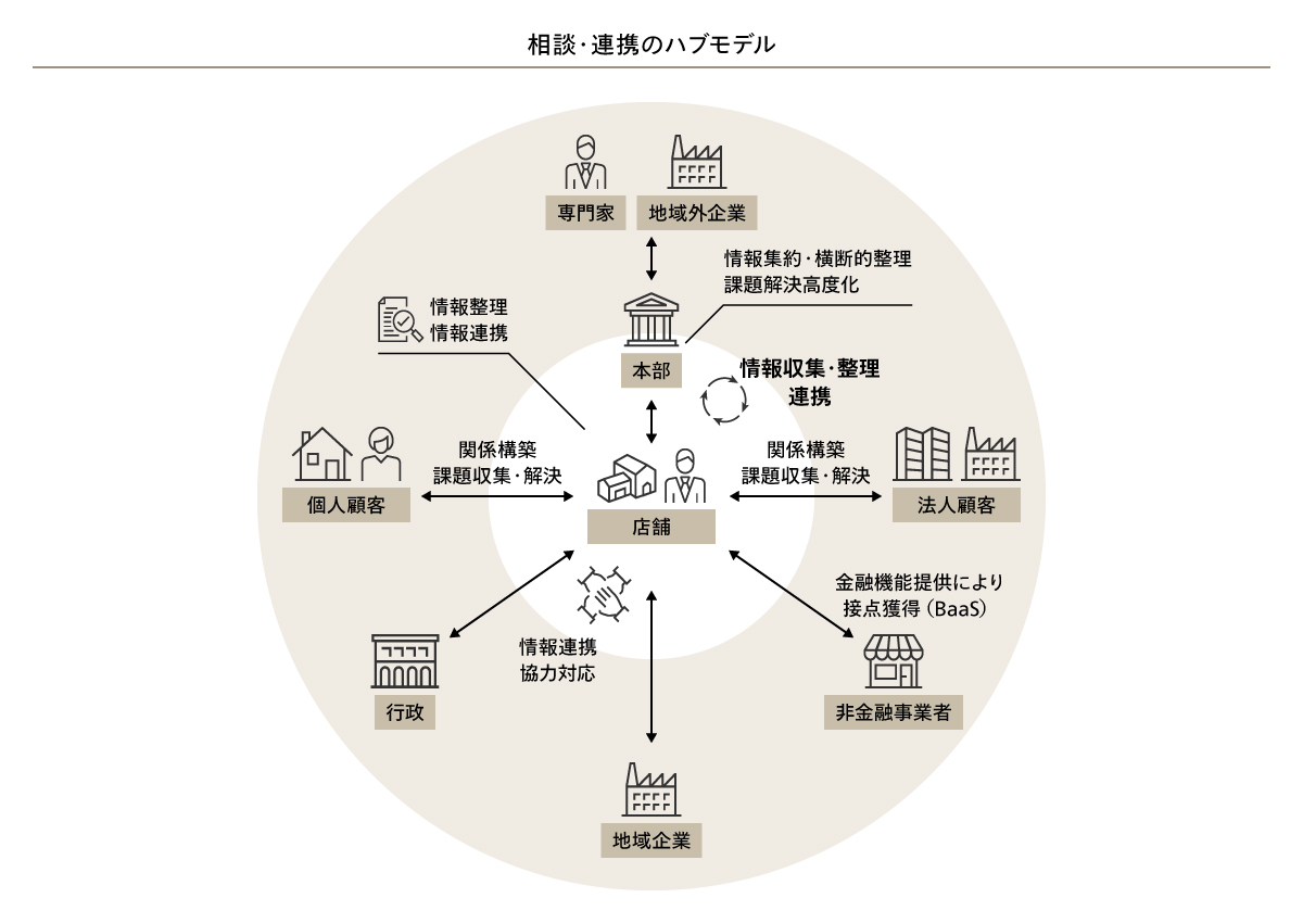 こうした取り組みを通じて、これからの店舗は単なる取引拠点ではなく、顧客や地域の課題を起点に内部外部の機能を結び付ける「相談・連携のハブ」へと進化する必要がある。ここでいう「ハブ」とは、本部施策の実行拠点にとどまらず、現場で把握した課題を起点に本部の専門部署やグループ会社、外部専門家、自治体、さらには非金融事業者をつなぎ、解決まで伴走する中核機能を指す。
