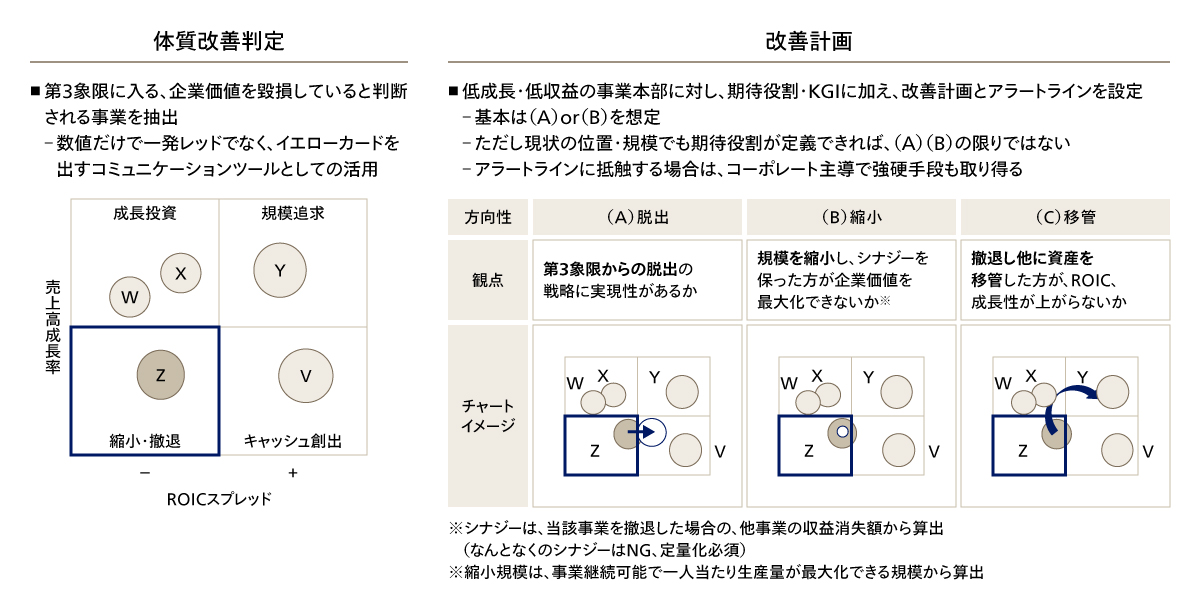 東証からの要請もあり、PBR1倍割れの解消、すなわち企業価値向上に向けた考え方として、長期ビジョンや中期経営計画を発表するほぼすべての企業で「事業ポートフォリオ変革」が掲げられている。既存の基盤事業を改善することやキャッシュカウとしての役割と、成長事業への投資を謳い、右肩上がりで成長しながら全社の事業構成も変化していくストーリーをよく目にする。しかし、多くの企業は事業ポートフォリオ変革が道半ばにとどまり、業績は依然として既存業務に依存している状況にある。また、成長投資の対象であった事業でM&Aを行うも、立ち上げが想定通りに進まず、結果的に減損を計上するケースもあり、当初想定したビジョンを実現できていないケースもある。結果、投資家からの厳しい評価や、企業価値が低調である場合には買収リスクにさらされる。