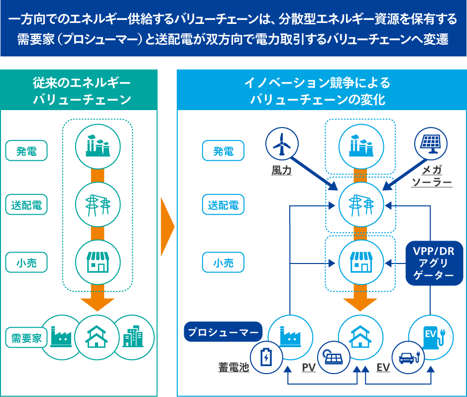 その結果、従来の大型発電所から需要家に対して1方向でエネルギーを供給するエネルギーバリューチェーンは、VPP/DRアグリゲーターなどの新たなプレーヤーが参入し、需要家(プロシューマー)とエネルギー事業者が双方向にて電力を取引する新たなエネルギーバリューチェーンに変遷している。(図2参照)