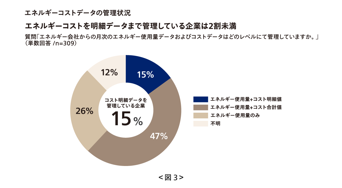 さらに、企業経営と統合したGXマネジメント構築の基盤となる、温室効果ガス排出量のデータ管理/報告の仕組みについて、「エネルギー使用量のみ」もしくは「エネルギー使用量+コスト合計値」が73%を占めており、従来の法対応を前提とした対象のみしか管理できていない状況が判明しました。また、将来的なエネルギー価格予測するために必要となるエネルギーコストの明細データ(契約単価、再エネ賦課金、燃料・原料調整費等)まで一元管理している企業は15%に留まっていることも明らかになりました(図3)。