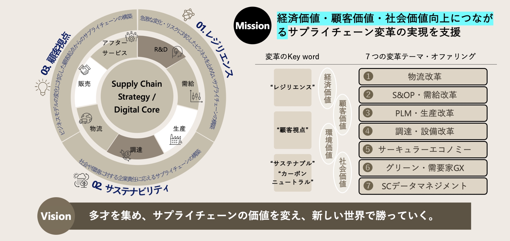 本質的なミッションは、「日系企業のサプライチェーン競争力を強化すること」にあります。従来の製造業中心の枠組みを超えて、商社、エネルギー、公共など幅広い業界を横断しながら、グローバル市場で戦う日本企業がサプライチェーンを強みに成長し続けられる変革を支援しています。