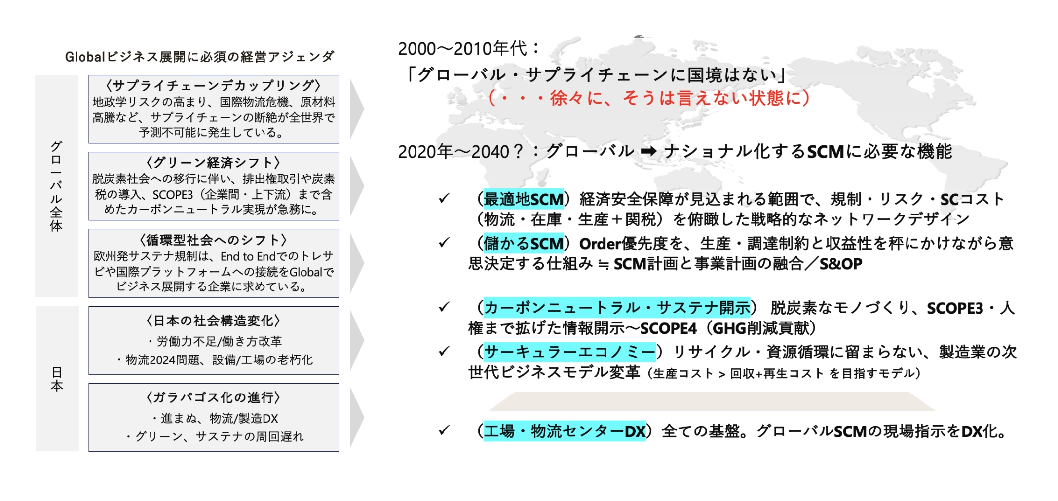 2020年頃までメディアで「サプライチェーン」という言葉が取り上げられることは稀でしたが、現在ではSCMが各社の重要な戦略領域として認識されるようになりました。さらなる変化は「グローバル最適化」から「最適地での循環」への転換です。これまでの「国境を越えたグローバルサプライチェーン」という発想は、デカップリングも経て過去のものとなり、地域内で資源を循環させる方向へとシフトしていくと考えます。
