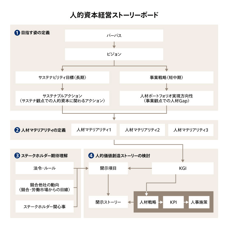 そのためには、ビジョン達成や企業存続、普遍的な競争優位性の維持といった長期的なサステナビリティ目標だけではなく、中期的な経営戦略・事業戦略の実現のためにどのような人材がどれくらい必要なのかという人材ポートフォリオ実現のための方向性を、長期的・中短期の両面から検討する必要があります。その上で、特定された人材マテリアリティに対しての数値目標であるKGIの設定、それを達成するための人材戦略および人事施策の策定、そしてその施策の進捗を測るKPIを設定し、社外ステークホルダーの関心事もくみとりながら、一連の取り組みをどう外部に訴求するか、全体の一貫したストーリーにまとめ上げていきます。これこそが「人的資本価値創造ストーリー」であり、人的資本経営を推進するためのゆるぎない軸となります。