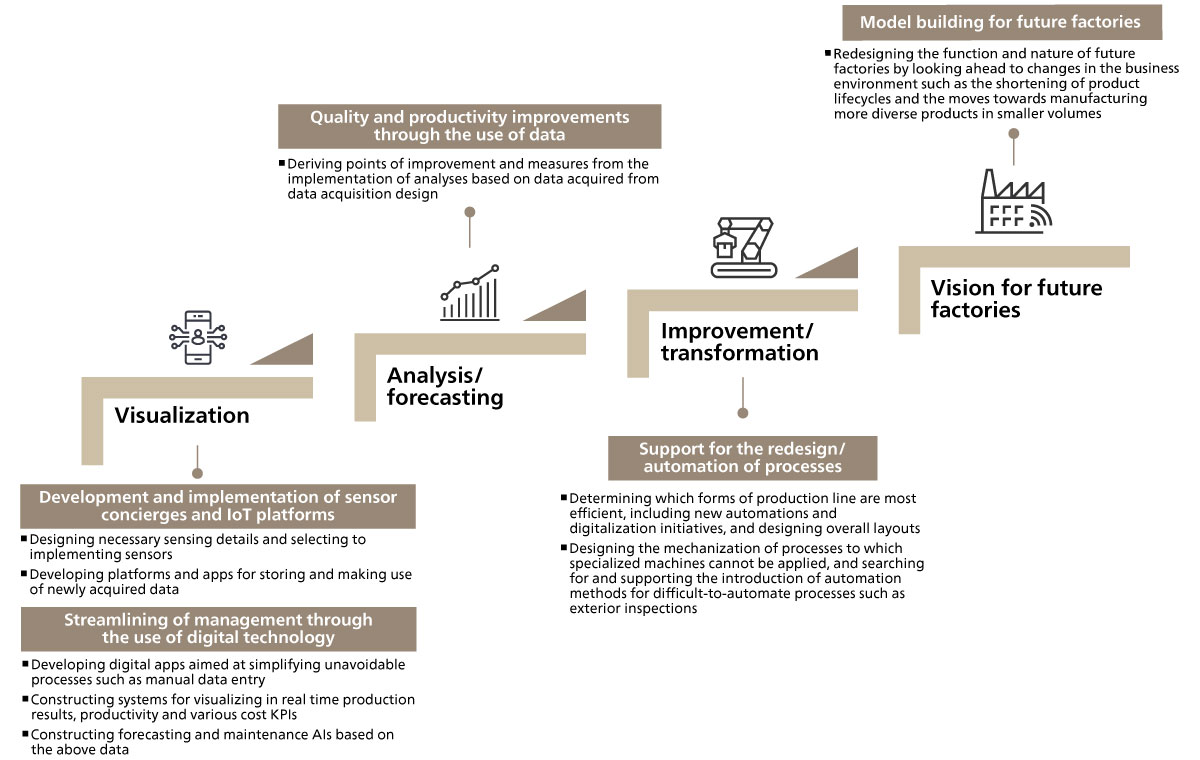 These come in the form of labor shortages stemming from a declining and aging population, diversification of product lineups and manufacturing variety and volume, difficulties in passing on technical skills as skilled technicians retire, and operational limitations stemming from individualization of work. They also encompass external factors in the form of decarbonization and geopolitical risks, and supply chain disruptions, and pressures over threats to the competitive edges of companies.