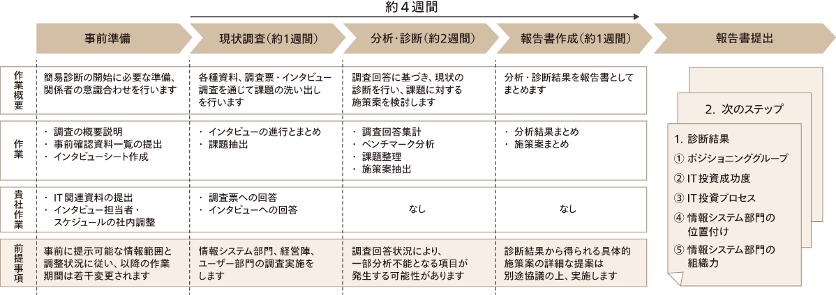 「IT投資マネジメント簡易診断サービス~IMPACT※~」は、企業のITマネジメントの現状を評価し、効果をもたらすIT投資マネジメントの実現に向けた提言を短期間で作成するサービスです。