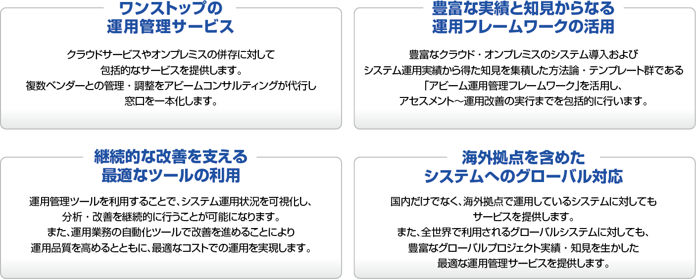 アビームコンサルティングは「アビーム運用管理フレームワーク」を活用し、企業の実態に即した“使える”運用を整備し、実効力のあるソリューションを提供します。