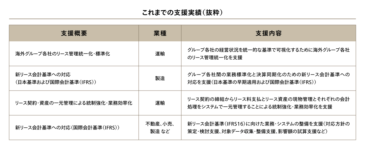 リース/不動産管理の知見と、業務プロセス改革・システム導入の豊富な実績をもとに、各社の事業特性や課題に即した最適なソリューションを提案します。