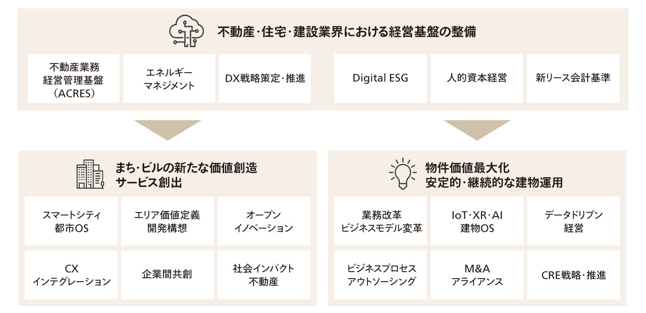 不動産・建設・住宅業界においては、"ヒト"視点にたち、「働く」「楽しむ」「暮らす」といった多様なニーズを捉え、まち・建物をモノではなくサービスとして提供すること、生産性の向上、多様な資金調達、関係者全体での適切なリスク管理により確実に事業収益を確保することにより、まち・建物全体で顧客価値を高めることが求められています。