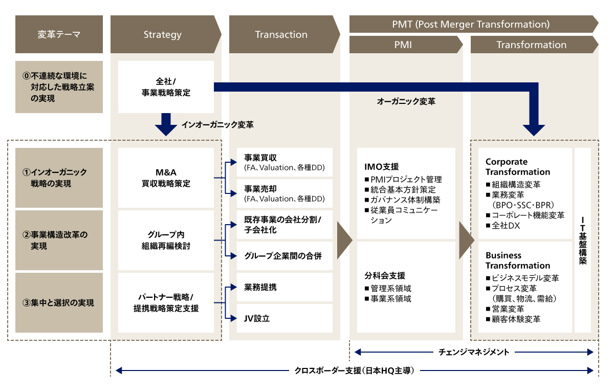 Post-M&Aの段階では、計画されたシナジーの実現と経済的リターンの最大化が焦点となります。このプロセスでの主な課題は、統合後の運営や市場拡大が期待通りに進まないリスクです。シナジーが十分に創出されない場合、期待された企業価値の向上が得られない恐れがあります。これを防ぐためには、統合後に期待される成果を明確にし、それに向けた企業のトランスフォーメーション後の目指す姿を含む、具体的なアクションプランまで含めた計画を策定する必要があります。また、迅速かつ効果的な意思決定を行うために体制整備も同じく重要です。シナジー実現のための指標を用いて進捗を定期的に評価し、必要に応じて計画を修正することで、M&Aの成功を確実にすることが可能です。