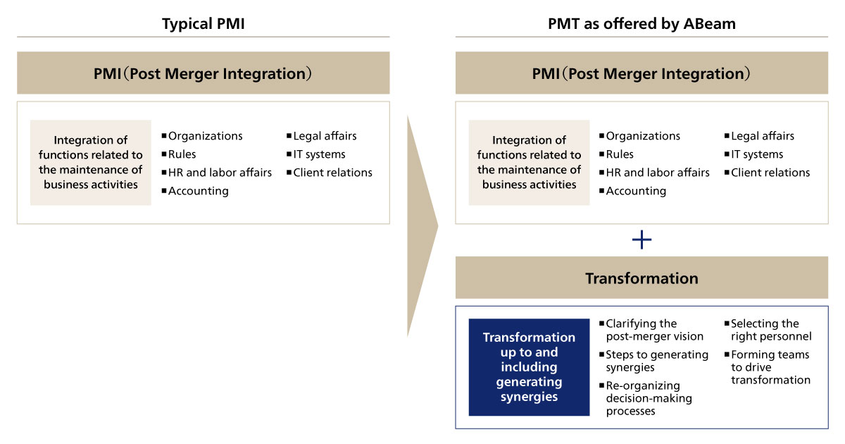 Through a framework of Post Merger Transformation (PMT), ABeam Consulting advances not only the “integration of functions related to maintaining companies” that is done in typical PMI processes, but also subsequent structural transformation.