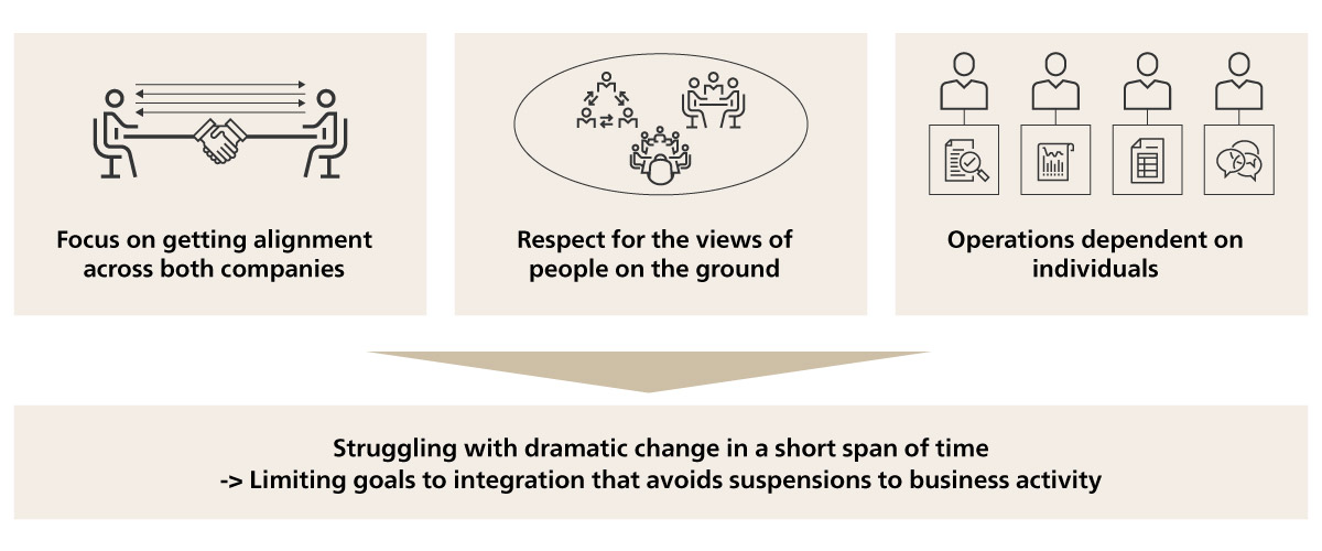 We often see cases in Japan where the Japan-specific management style and culture of “overfocusing on aligning both companies and excessively respecting the views of people on the ground gets in the way of decisive decision making” ends up being a bottleneck for post-merger transformation. In other words, the Japanese style and culture of careful decision making processes and individual-dependent operations makes it difficult to achieve rapid change in a short span of time. As a result, “integrating,” which should come at a much earlier stage, ends up being the goal, rather than “generating synergy.”