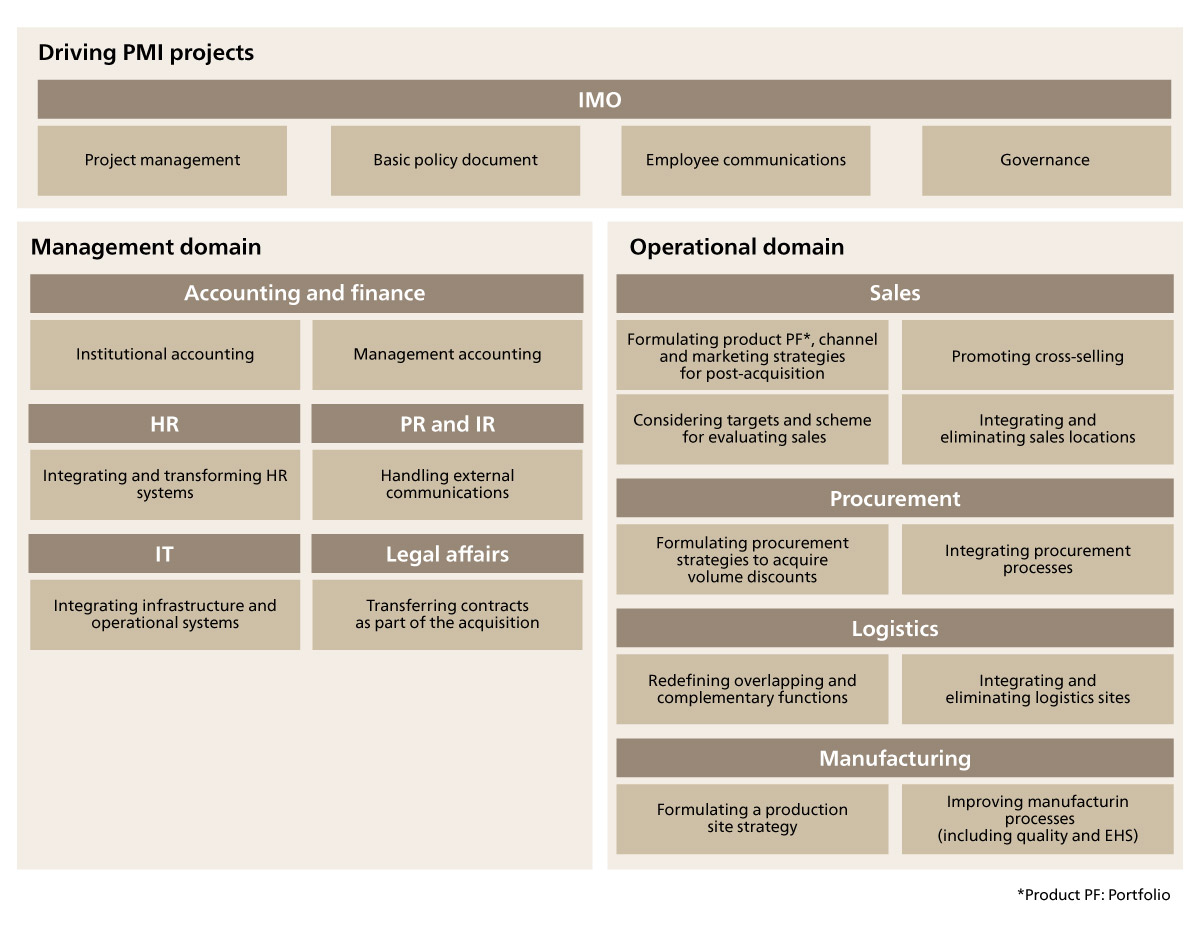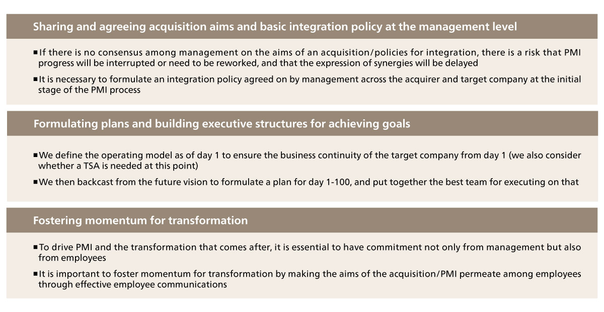 A wide range of stakeholders contribute to PMI, so companies need to get alignment among management teams across buyer, seller and target company, and foster momentum for transformation involving employees who execute the various PMI measures.