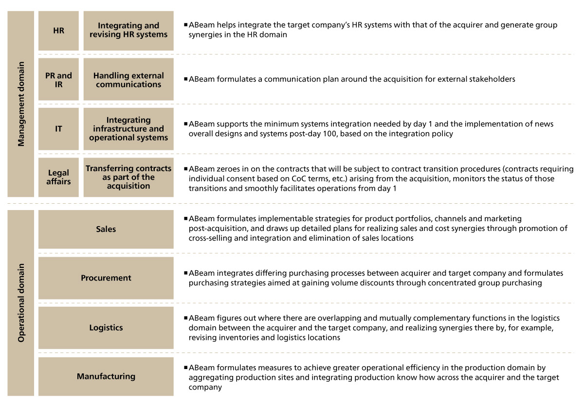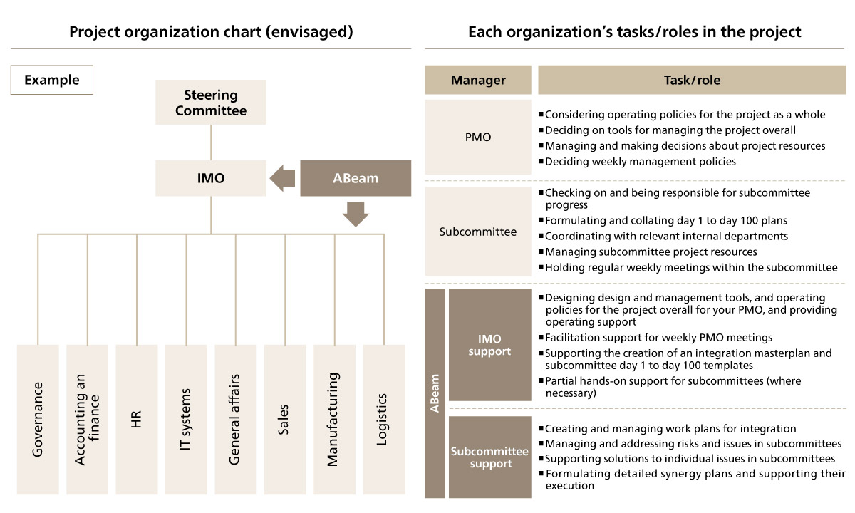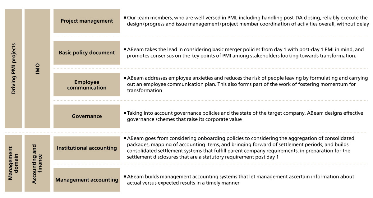 The support offered by ABeam’s Integration Management Office (IMO) goes beyond project management to support execution of key post-acquisition events and themes such as formulating basic policies needed for PMI and formulating policies for employee communications and governance.