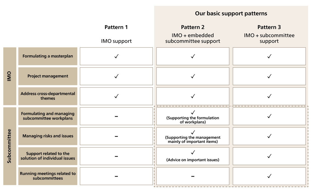 ABeam provides deeply embedded support to subcommittees from the standpoint of an IMO, comprehensively supporting client PMI. We drive projects forward, avoiding delays by identifying early on tasks that span multiple subcommittees or for which responsible personnel is unclear and, in some cases, providing support by executing those tasks ourselves as an IMO. We can also provide focused support by ABeam experts to specific subcommittees in response to client needs or the state of the project.