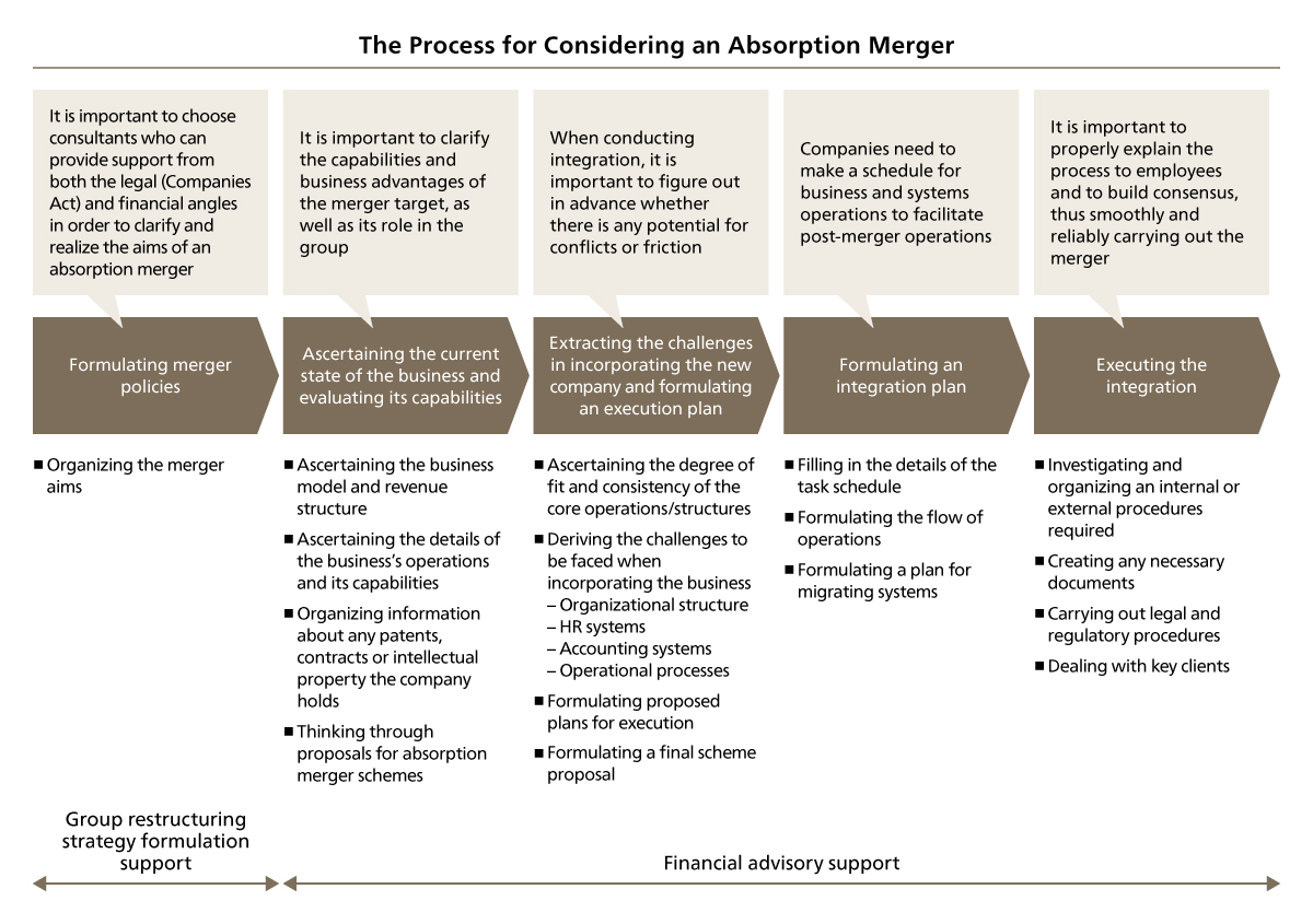 Companies need to execute absorption-mergers in line with their strategic directions without losing sight of the initial aims of the merger, while also taking into account the situation of the target business and the opinions of stakeholders. It is also important to move forward on the basis of consistent policy, while retaining the flexibility to maximize the creation of synergies post-merger.