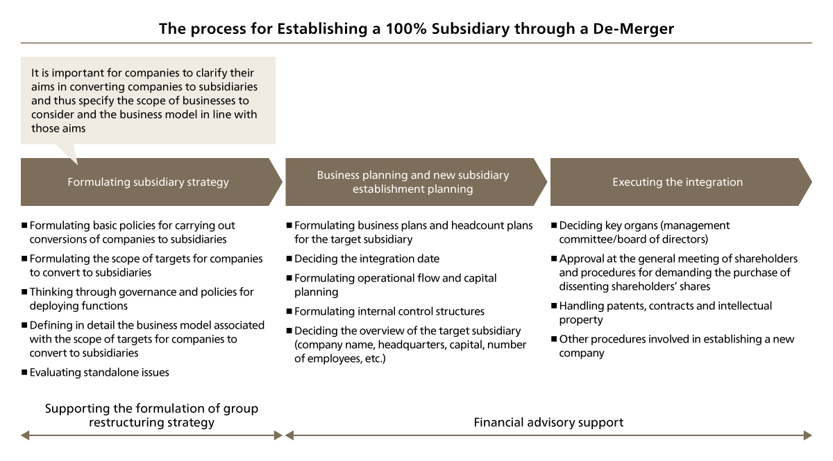 It is essential for companies to clarify their aims in converting companies to subsidiaries and to objectively verify the strategic purpose and the feasibility of the outcomes they expect to deliver. In particular, companies need to carefully analyze whether the benefits that come from converting a company to a subsidiary can be expressed sustainably from the points of view of creating synergies, streamlining management and distributing risk. Companies also need to evaluate feasibility in terms of organizational structure and the financial side of things from multiple angles and formulate the right segmentation strategy, based on trends in the business environment and on market trends.