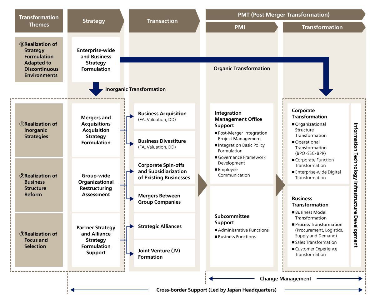 In the post-mergers and acquisitions phase, the focus is on realizing planned synergies and maximizing economic returns. The primary challenges in this process include the risk that post-integration operations and market expansion may not progress as expected. If sufficient synergies are not generated, there is a risk that the anticipated enhancement of corporate value will not be achieved. To prevent this, it is necessary to clearly define the outcomes expected after integration and to formulate a plan that includes concrete action plans, incorporating the target state of the company after transformation. In addition, establishing an appropriate organizational structure is equally important to enable swift and effective decision-making. By regularly assessing progress using indicators for synergy realization and revising plans as necessary, it becomes possible to ensure the success of mergers and acquisitions.