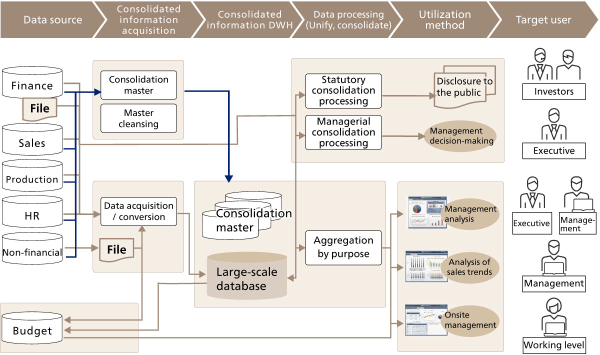 In order to reinforce consolidated management, it is necessary to visualize management information according to the objective of each type of management, upon defining the necessary timing, accuracy and scope. ABeam Consulting proposes to define the framework of consolidated enterprise management for each purpose as follows and proposes developing a system that will provide the information when necessary.