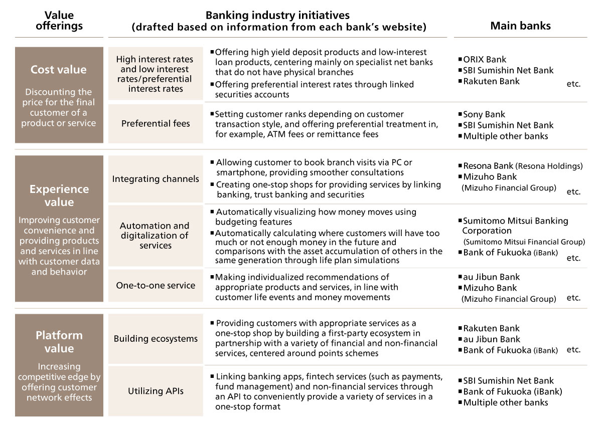 For digital banks and net banks placing an emphasis on ecosystems as a value offering, it is especially important to build platforms that integrate services from other companies through the use of APIs or inter-business partnerships, and to thus enclose customers in the ecosystem.