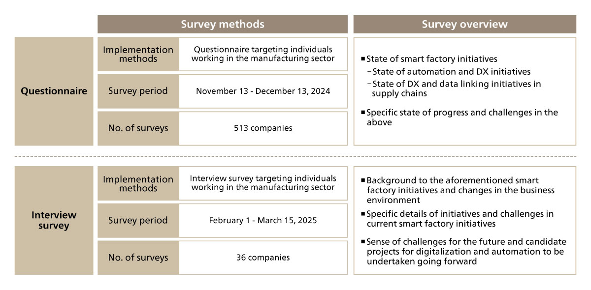 The aims of the recently conducted “Survey on the Current State of Smart Factories in Japan – Responding to Manufacturing Challenges Arising from Changes in the Business Environment” (hereinafter referred to as the Survey) are as follows.