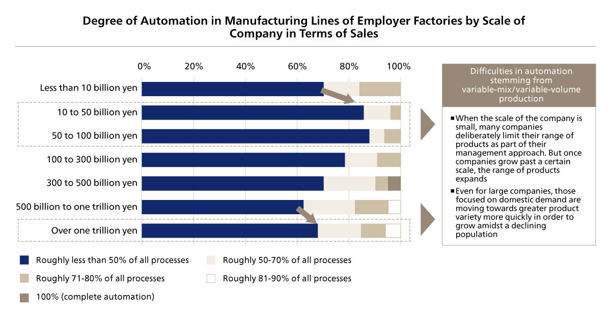 Companies with over ¥1 trillion in sales have also tended to work to expand their product lineups in recent times, seeking to maintain or expand their sales amidst a declining Japanese population, leading them either to diversify their products or to move towards variable-mix variable-volume production. It was stated this has put them in a position where they cannot simply automate the processes they now have.