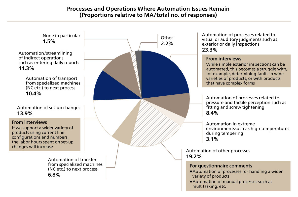 The questionnaire showed that the processes and operations that are presenting as bottlenecks to automation are: “Automation of processes related to visual or auditory judgments such as exterior or daily inspections,” “automation of other processes” and “automation of set-up changes” (see Figure 4).