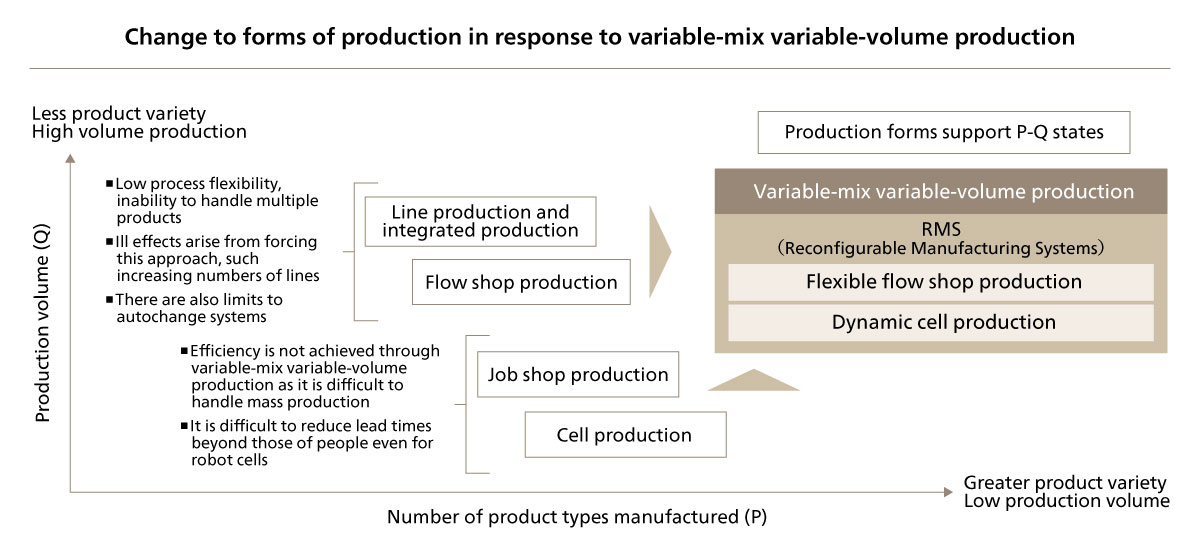 The optimal form of production differs intrinsically depending on whether a company is practicing high volume production of limited items or low volume production of a variety of items. As companies continue to move toward variable-mix variable-volume production, it is thus becoming impractical to approach this using existing line production and integrated production. In particular, there are limits to what can be done using traditional line production and job shop production approaches in variable-mix variable-volume production. We believe companies are thus at a point where they should consider moving towards new forms of production that support concepts such as reconfigurable manufacturing systems (RMS) (see Figure 8).