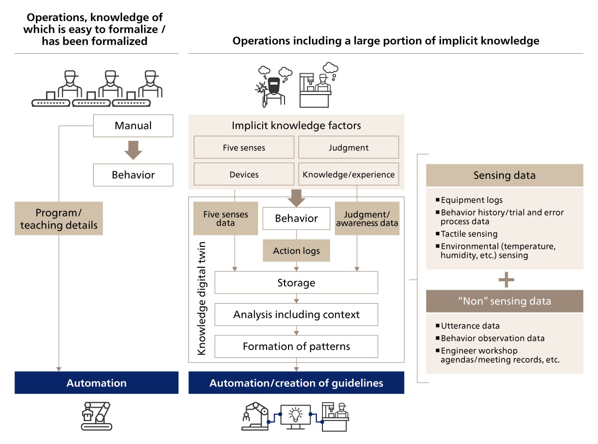 Such operations are made up of implicit knowledge, and represent the value of experience that comes from an accumulation of on-the-ground improvements. This has made them a source of competitive edge in Japanese manufacturing. On the other hand, they carry issues that make digitalization and automation difficult, because knowledge of such operations is not formalized.
