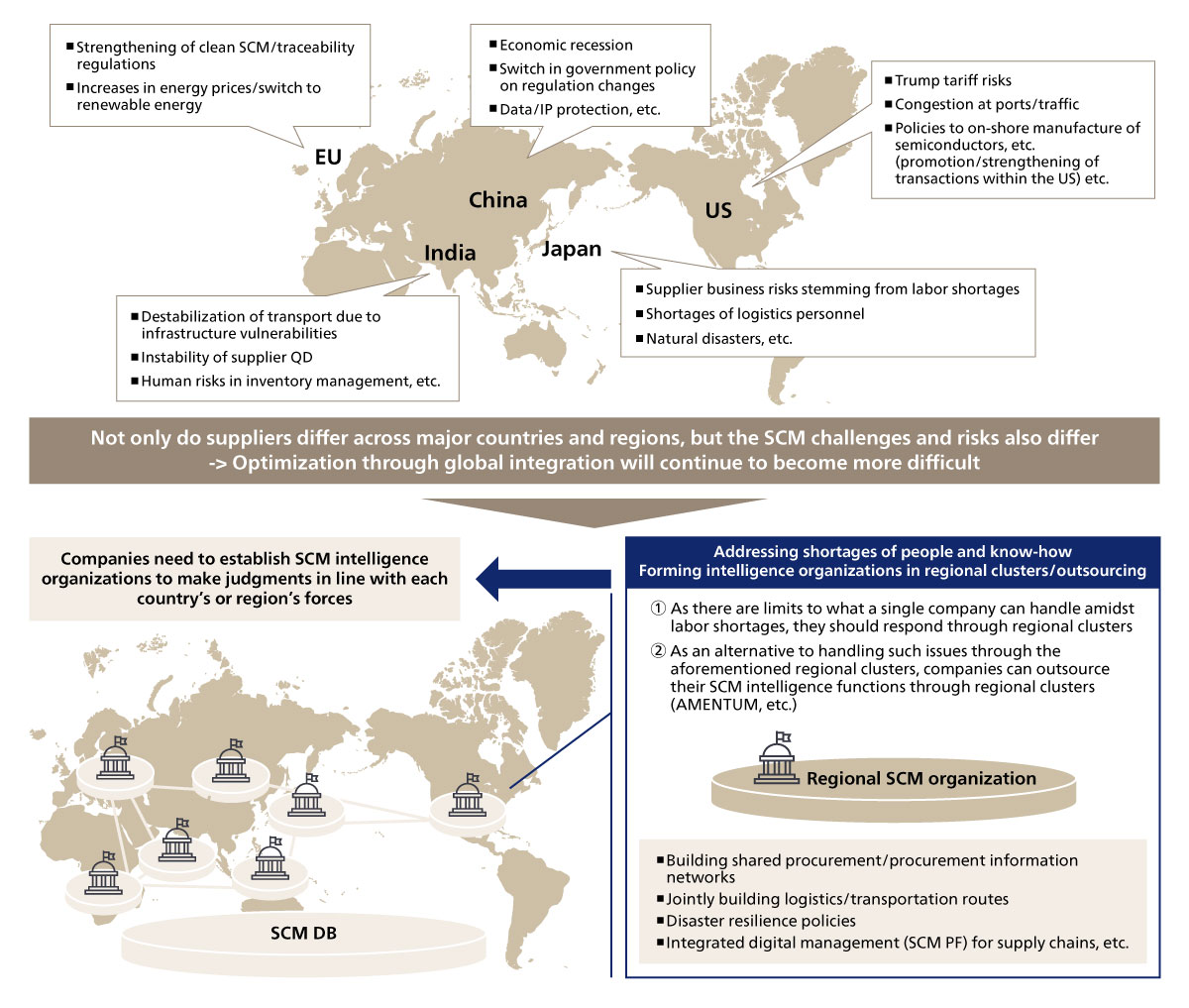 Amidst this, globally integrated SCM operations have become more difficult. This has made it necessary for companies to have national and regional SCM operations organizations, as well as frameworks for supporting the integration of suppliers and the streamlining of deliveries spanning nations and regions through the integration of data.