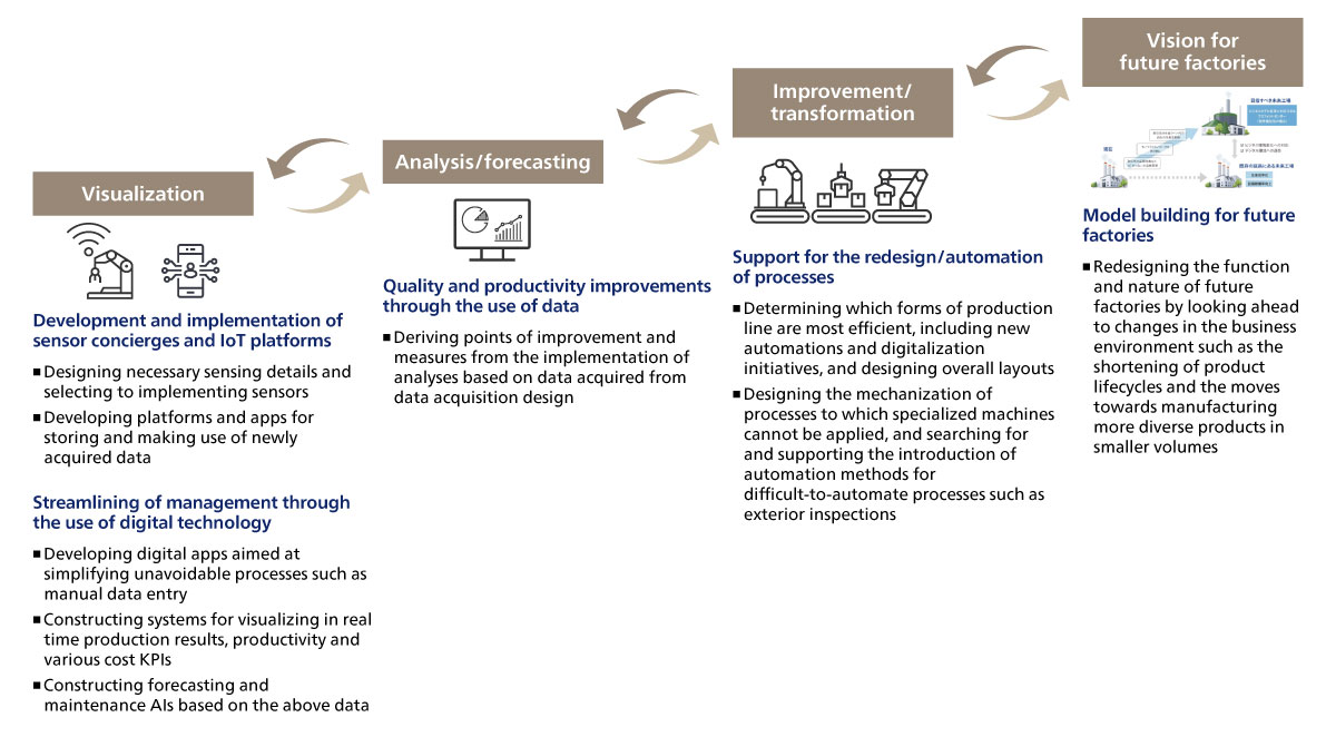 As the sector also addresses changes in the business environment, such as diversification of products and moves toward to variable-mix variable-volume production, it faces complex issues on the ground that cannot be addressed through simple digitalization or automation efforts, such as the need to maintain and streamline production.
